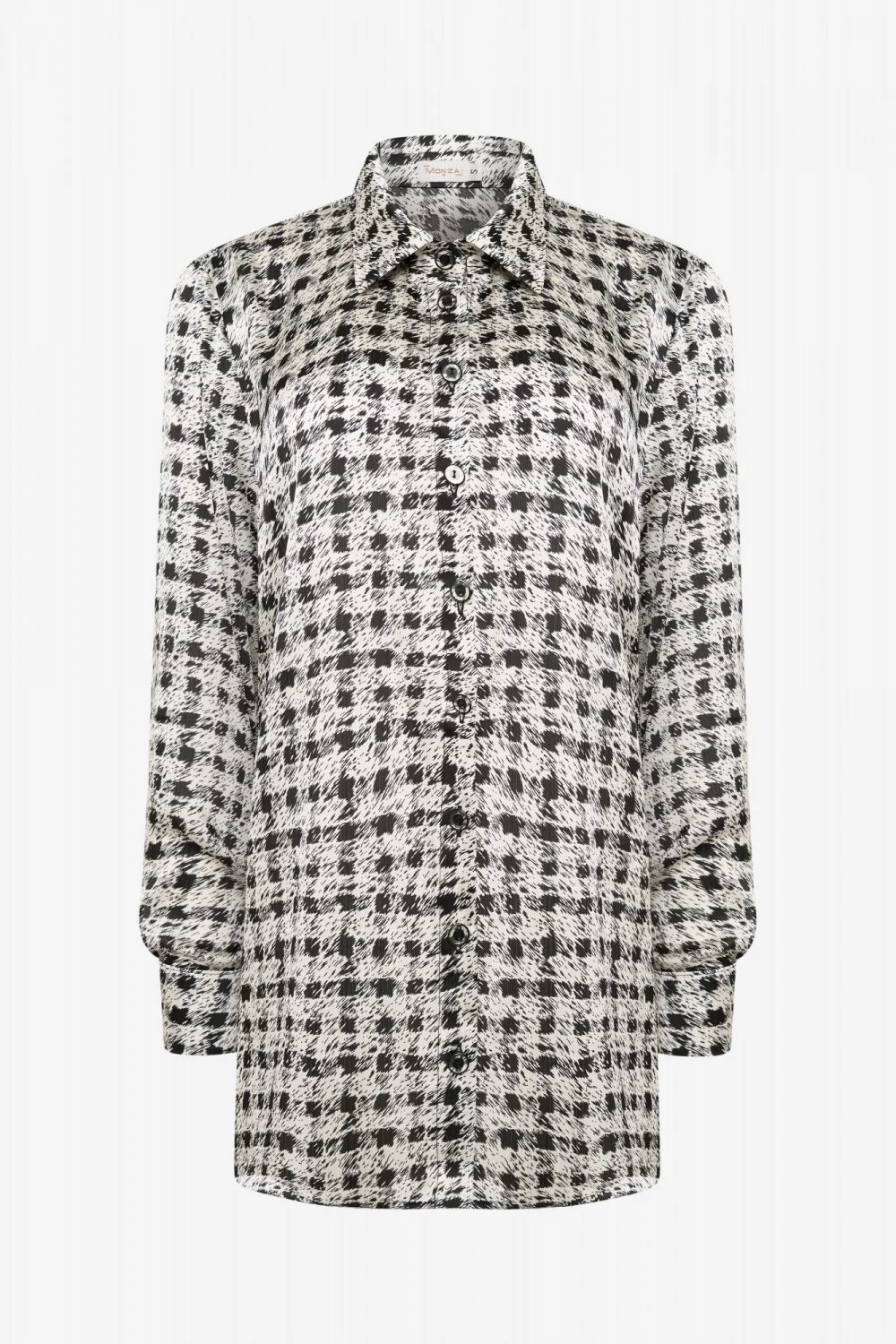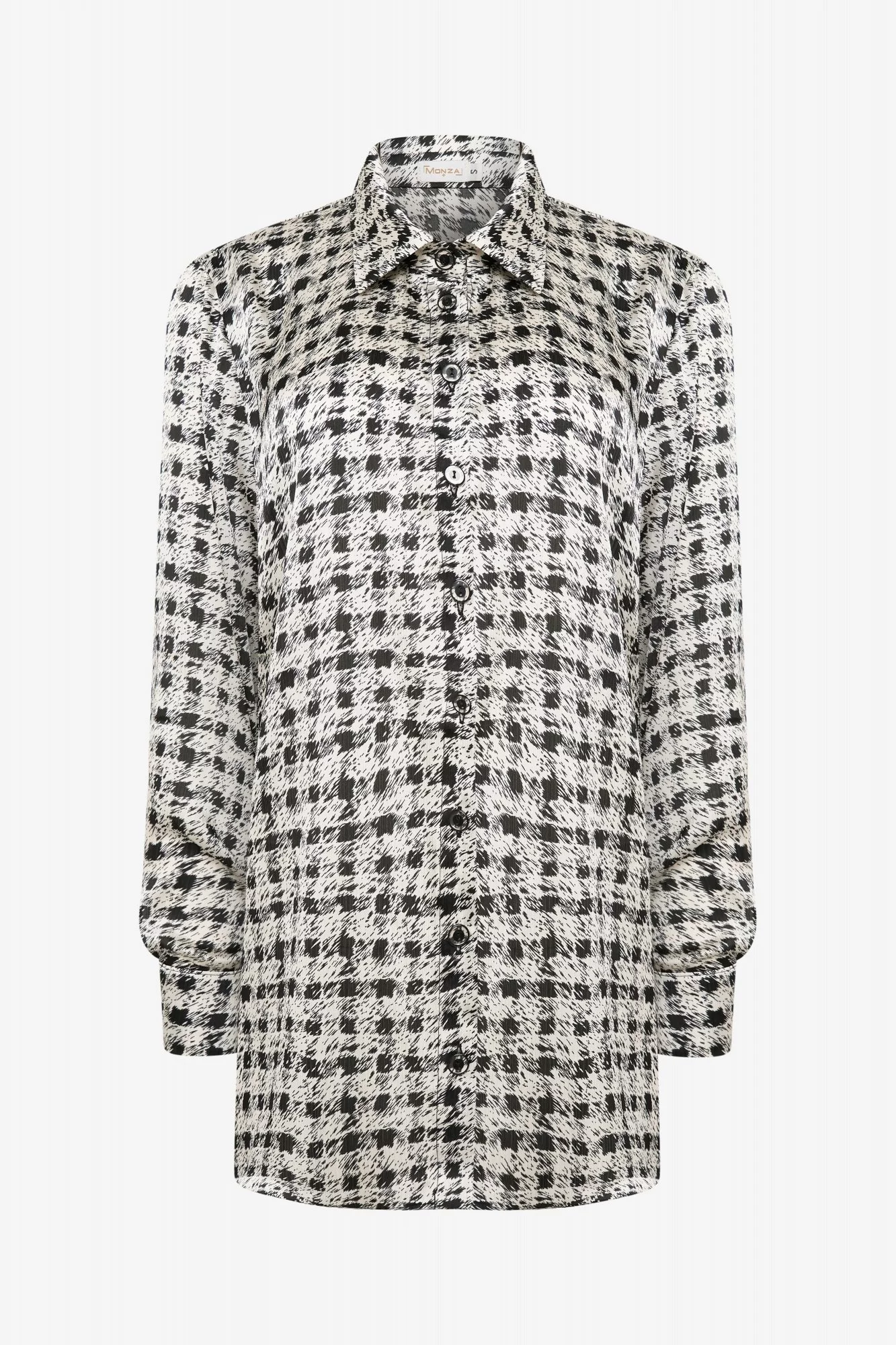Блузка свободного силуэта, из смесовой вискозы с принтом, длина миди. Воротник стояче-отложной. Спереди застежка пуговицы. Рукав длинный, на отрезной манжете, пройма широкая.