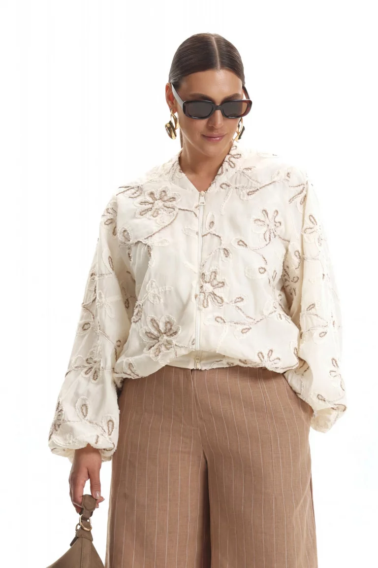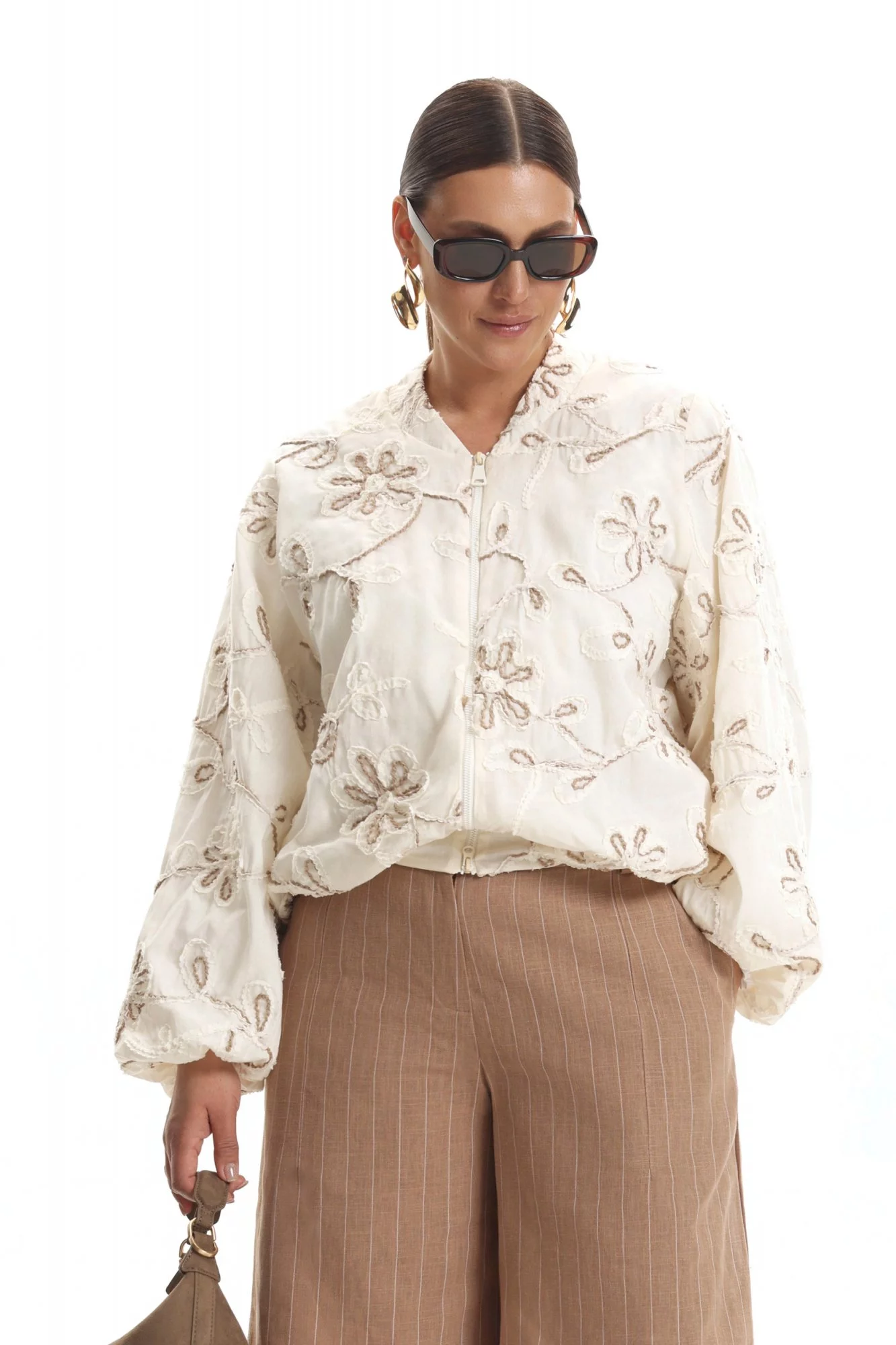 Бомбер из хлопка, на подкладке, с набивным рисунком и 3Д эффектом. Длина до талии. Воротник стойка, застежка молния спереди, длинный рукав, жиго, пройма углубленная. Манжет и низ на внутренней резинке-баллоне. Карманы внутренние.
