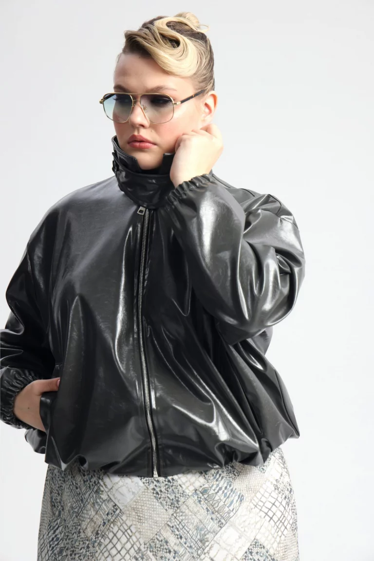 Бомбер из лаковой экокожи, на поливискозной подкладке. Длина до талии. Воротник высокая стойка с кулиской, застежка молния спереди, длинный рукав на манжете с небольшой сборкой, пройма углубленная. По низу внутренняя резинка баллон.