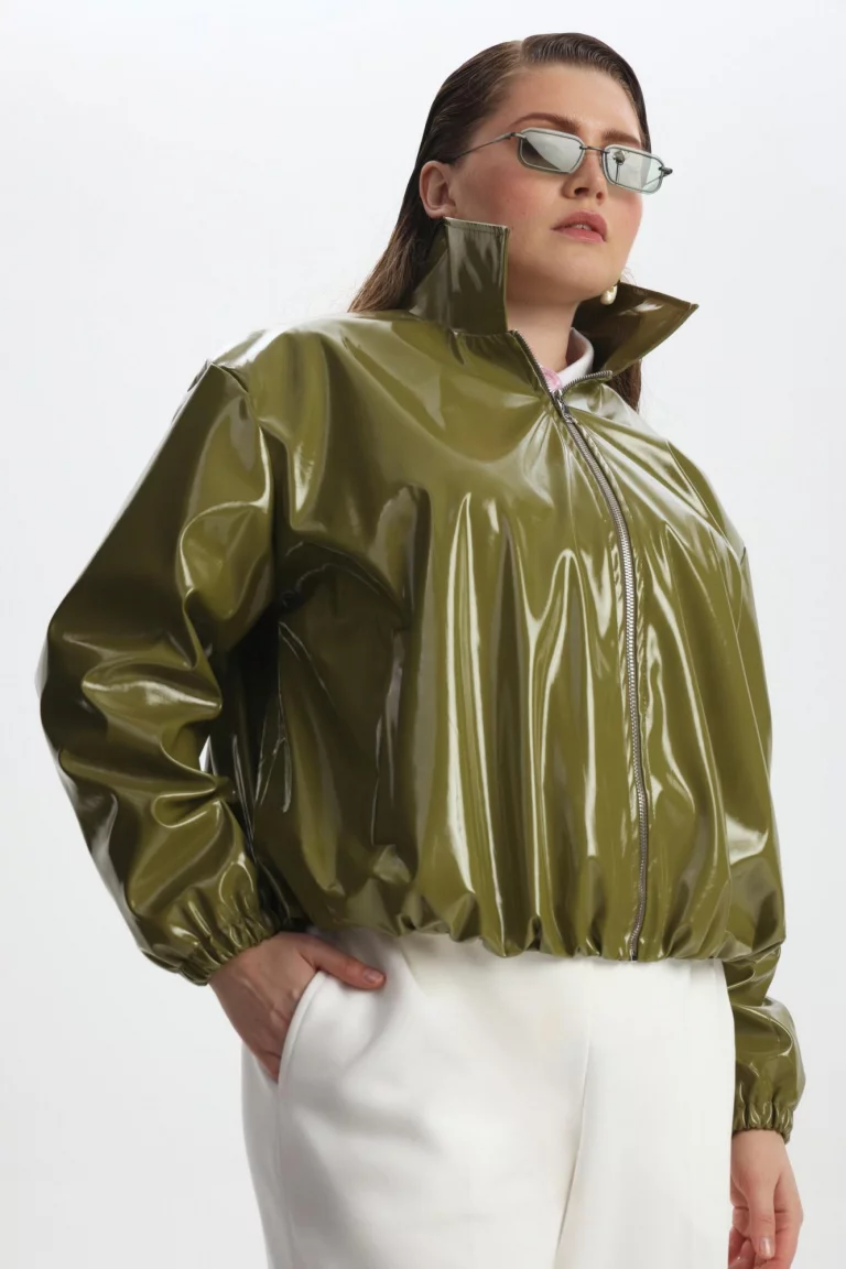 Бомбер из лаковой экокожи, на поливискозной подкладке. Длина до талии. Воротник высокая стойка с кулиской, застежка молния спереди, длинный рукав на манжете с небольшой сборкой, пройма углубленная. По низу внутренняя резинка баллон.