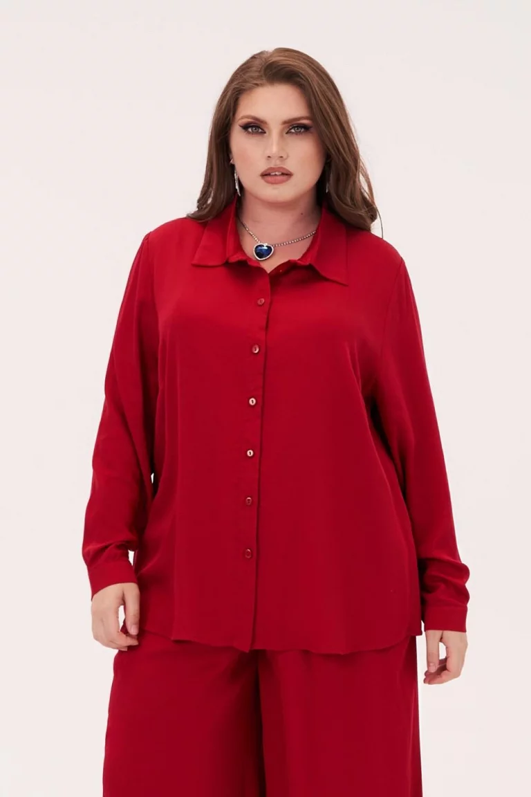 Рубашка свободного силуэта, из вискозы, длина миди. Воротник стояче-отложной. Спереди застежка пуговицы. Рукав длинный, на отрезной манжете, пройма широкая. Крой relaxed fit отличается достаточным удобством и практичностью. Подобный крой отлично подойдет тем людям, которые хотят иметь определенную свободу при ношении одежды, которая не сковывает движения человека.