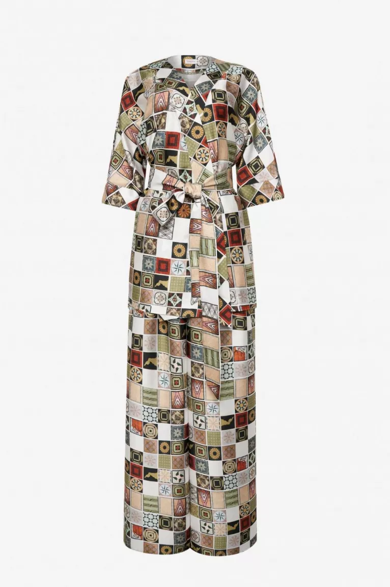Костюм в пижамном стиле с принтом пэчворк из кимоно и широких брюк. Кимоно цельнокроеное, без подкладки. Длина до бедра. Воротник шалевый. Кимоно на внутреннем поясе и запа́хе. Рукав 3/4, пройма широкая. Брюки широкие палаццо. Пояс на резинке сзади. Посадка высокая-high-wasted rise.