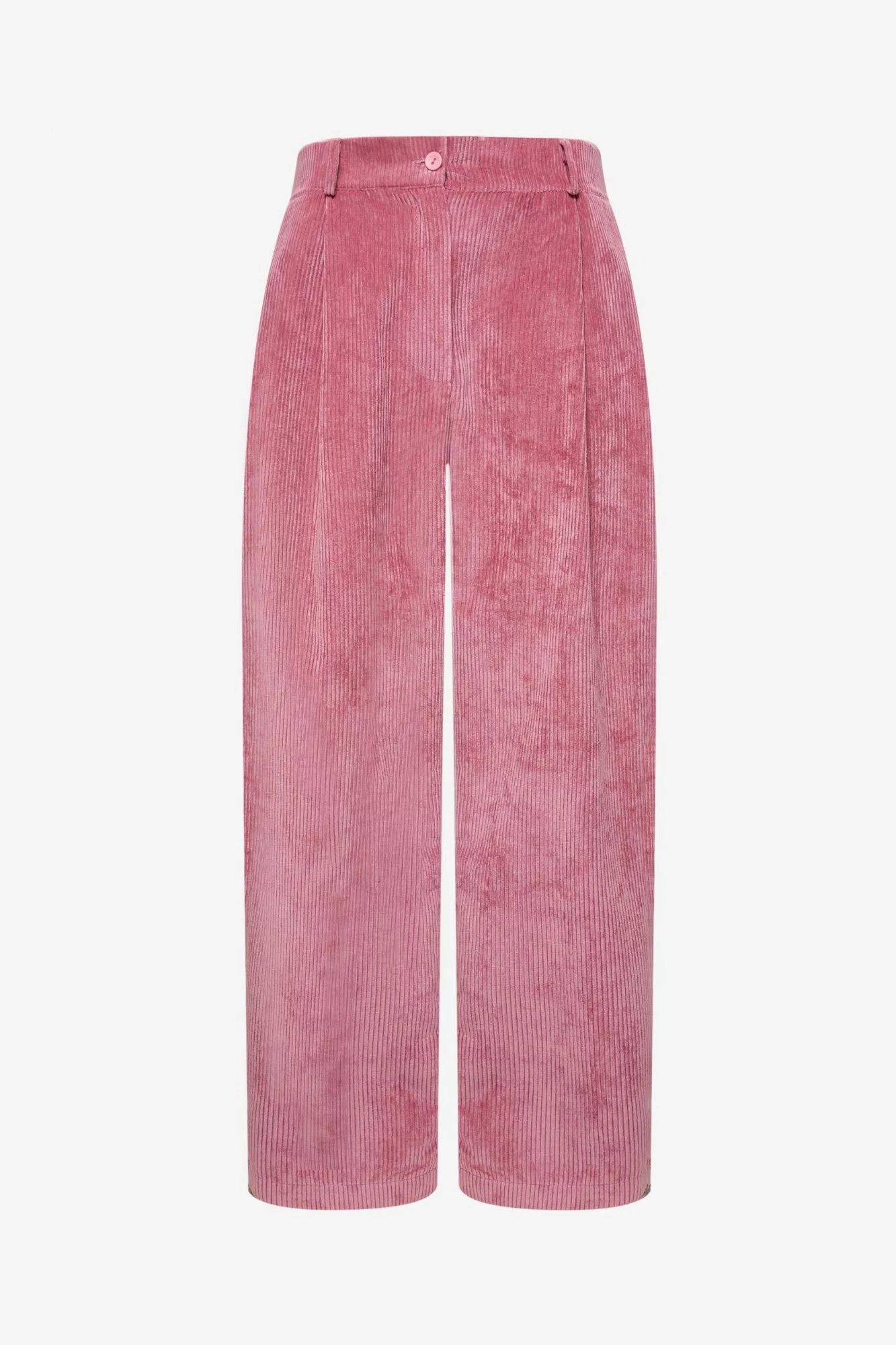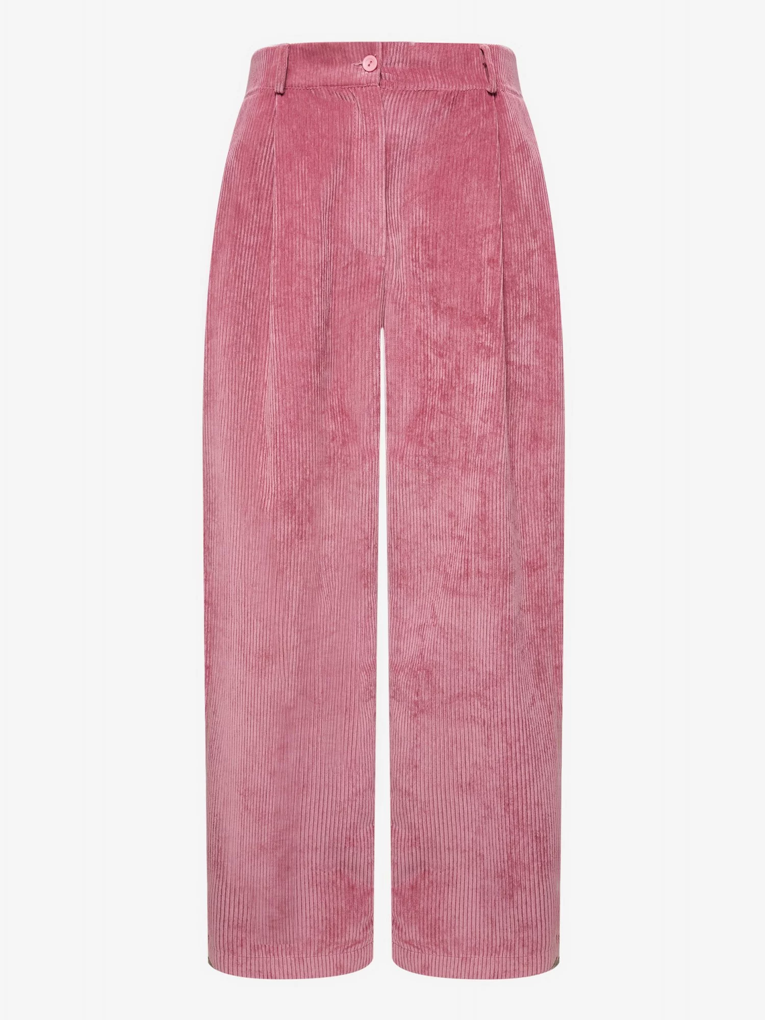 Брюки бананы из поливискозного вельвета. Пояс на резинке сзади, застежка молния, посадка высокая. По бокам карманы с отрезным бочком. Брюки с защипами. Сзади накладные карманы.