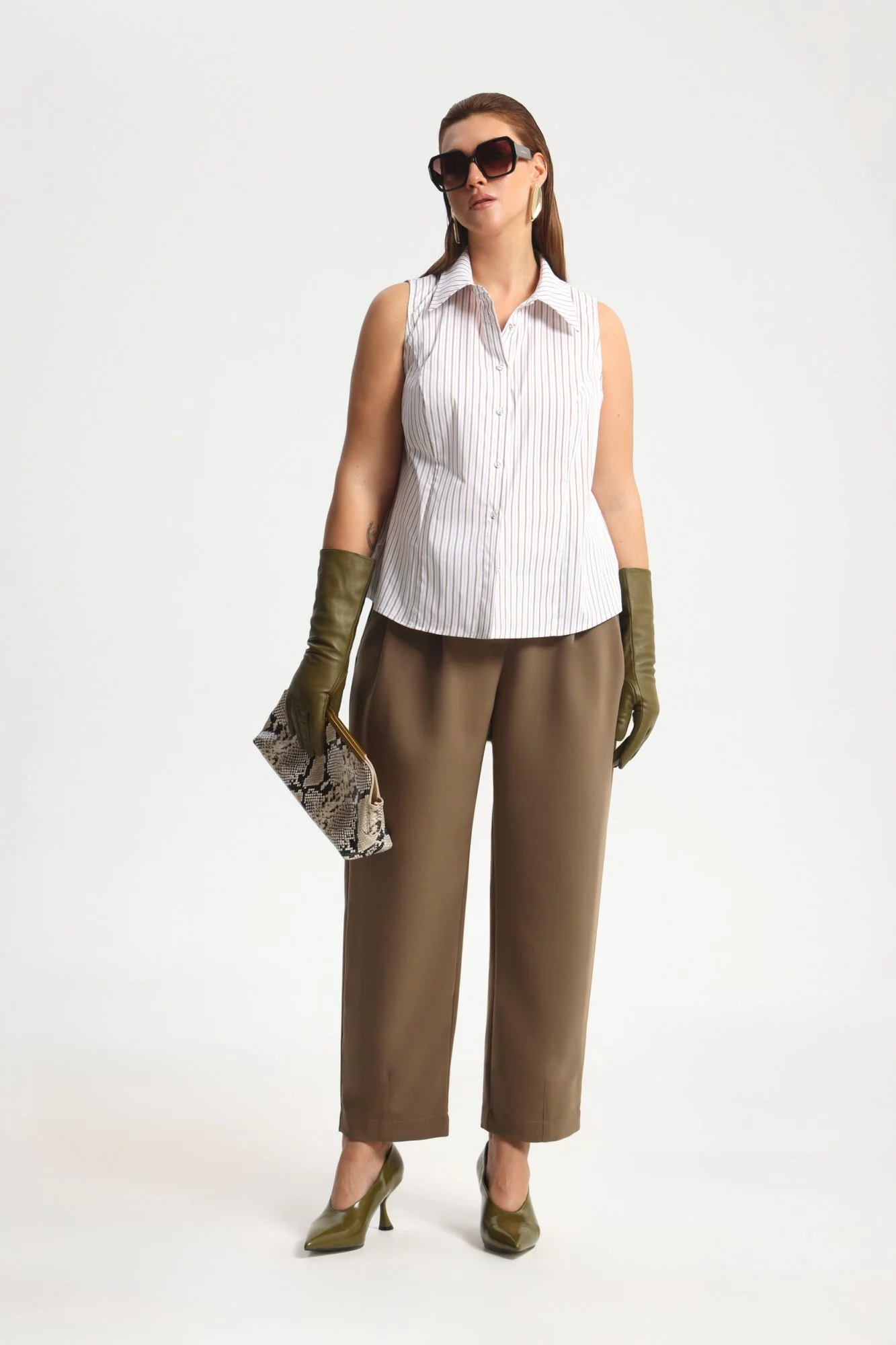 Брюки бананы из поливискозной костюмной ткани станут универсальным элементом гардероба. Посадка средняя. Застежка молния. Брюки со складками на контрастном поясе. По низу защипы. Карманы с отрезным бочком и шлевками для ремня.
