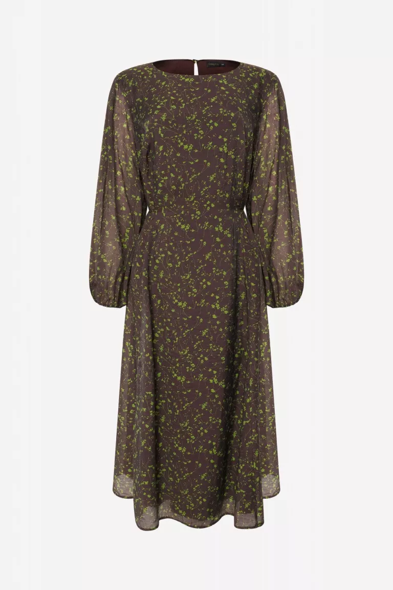 Чайное платье из тенселя на шелковой подкладке А-силуэта, длина миди. Горловина округлая, сзади застежка на пуговицу. Рукав длинный, на манжете, пройма широкая. Спереди рельефы. Нижняя часть расклешенная, на боковом вшитом поясе.