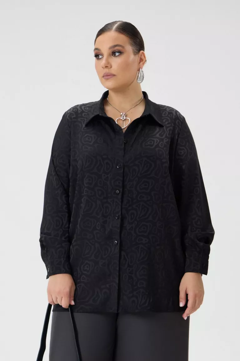 Рубашка свободного силуэта, из вискозы шелковистой фактуры, длина миди, разноуровневая. Воротник стояче-отложной. Спереди застежка пуговицы. Рукав длинный, на отрезной манжете, пройма широкая.
