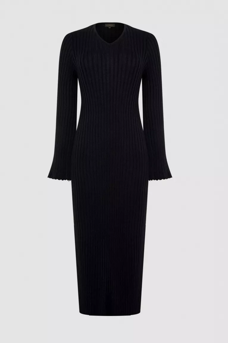 Платье прямого силуэта с V-образным вырезом, выполненное из смесового хлопкового трикотажа в стиле лапша. Длина миди, что придает ему элегантный и утонченный вид. Длинный рукав с расклешенным кроем и широкая пройма создают воздушный и стильный образ. Сзади предусмотрен разрез, что добавляет динамичности и комфорта при движении.