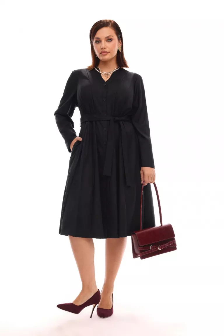 Платье на пуговицах из облегченной костюмной ткани, без подкладки, длиной миди. Рукав длинный, пройма углубленная. Платье с расклешенной юбкой, V-образным вырезом. Комплектуется тканевым поясом.