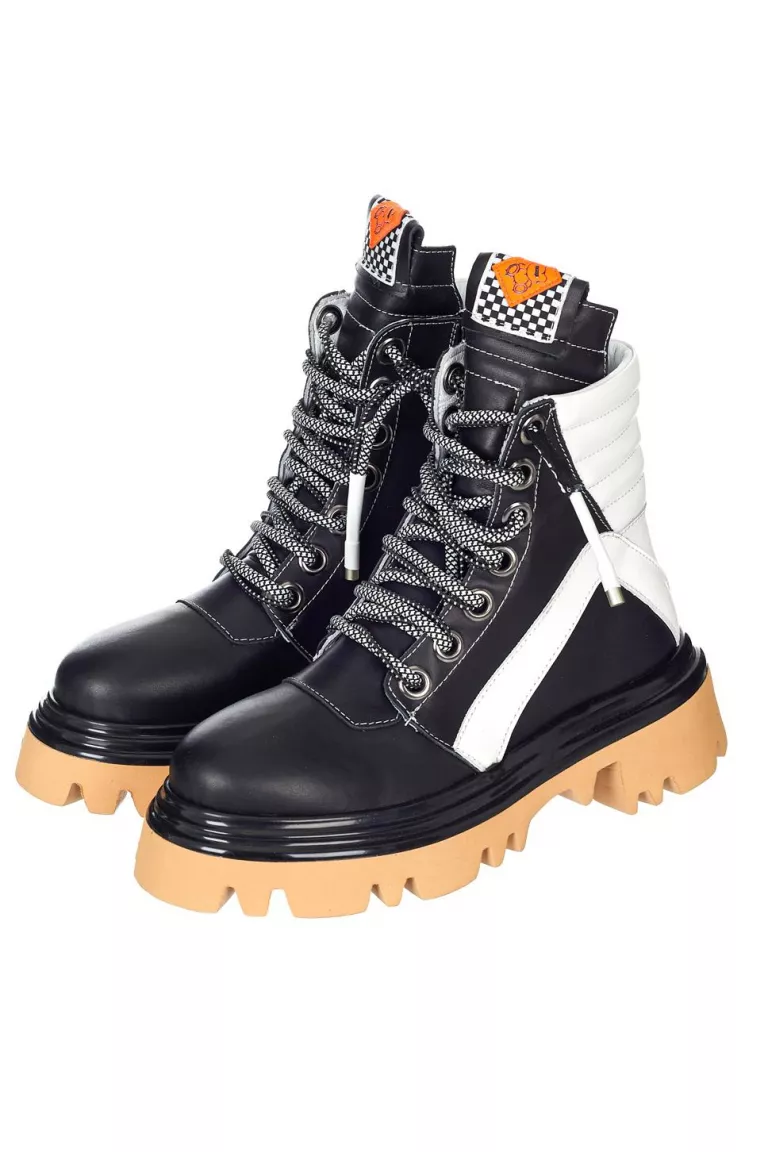 Ботинки Сеймур, на массивной подошве контрастного цвета, застежка молния и шнурок. Сзади усиленная вставка из кожи белого цвета. Мыс закругленный. Стелька и подкладка из мягкого велюра.