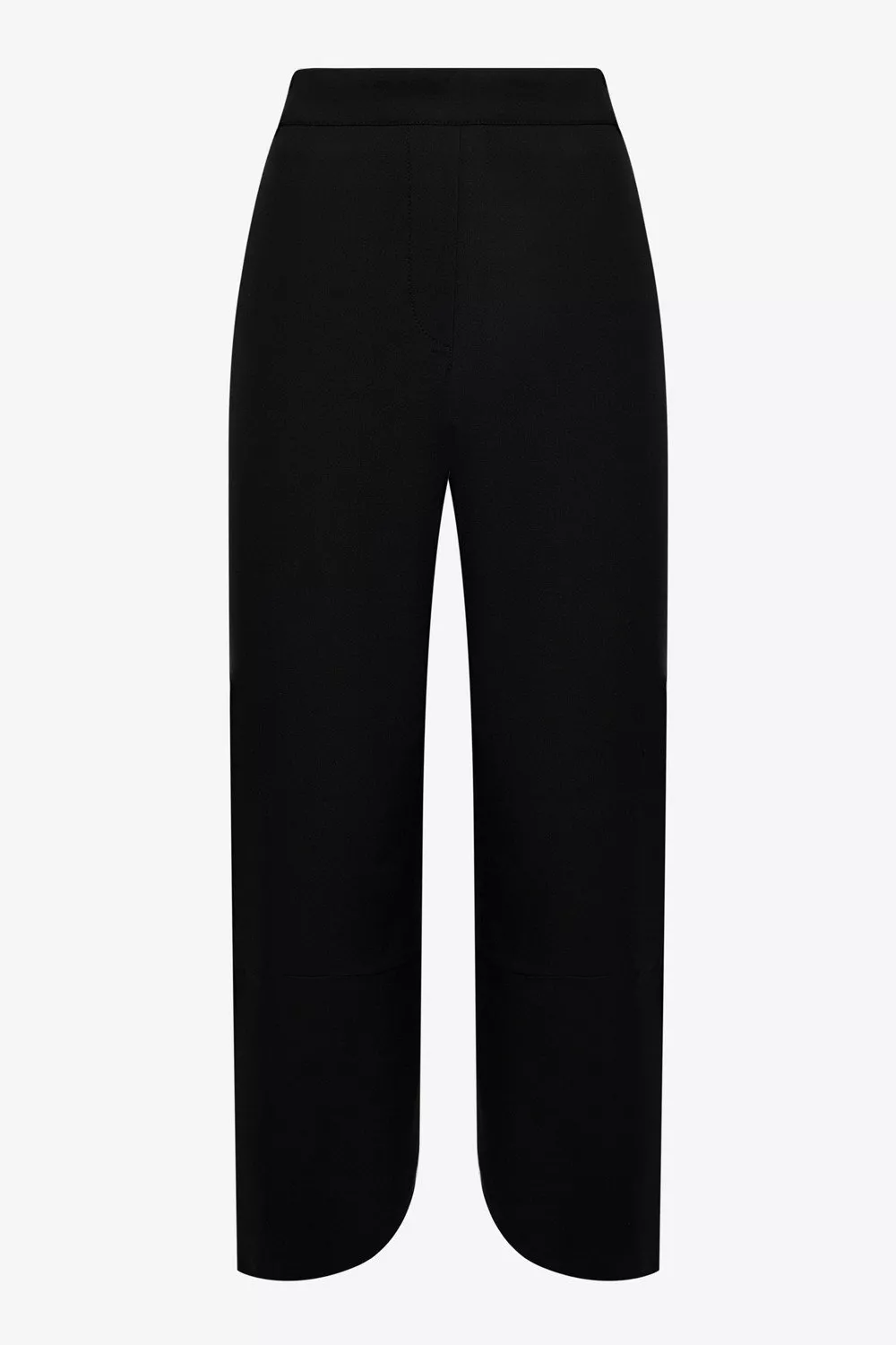 Брюки бананы из смесовой вискозной ткани, укороченной длины, с асимметричным низом. Имитация застежки, посадка высокая. Резинка в поясе сзади. По бокам карманы с отрезным бочком. Снизу конструктивная складка.
