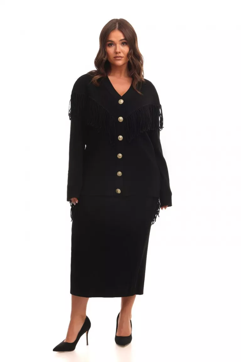 Кардиган прямого силуэта из плотного трикотажа. Рукав длинный, воротник V-образный. Застежка пуговицы. Отделка бахромой.