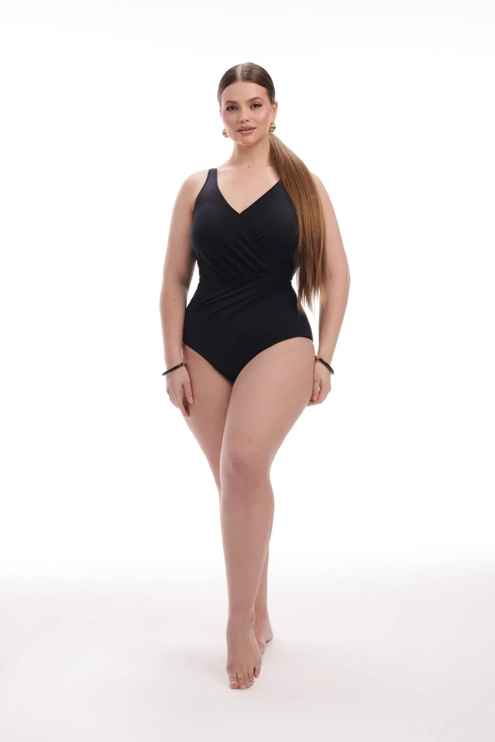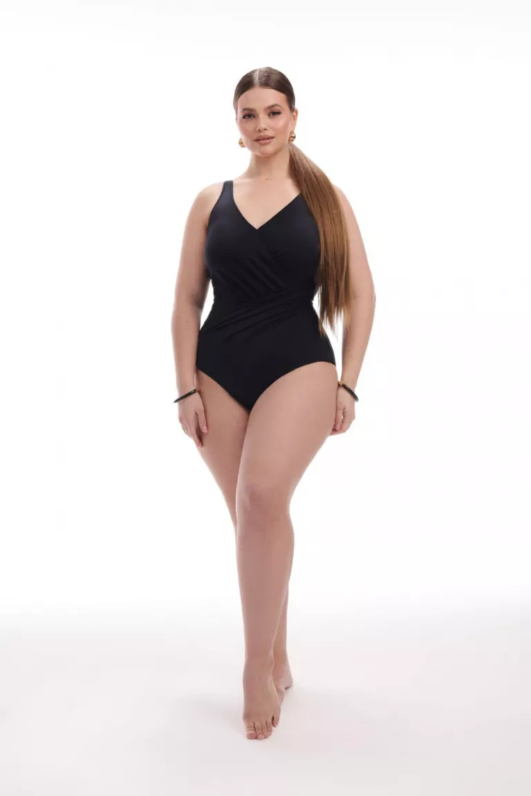 Слитный купальник-танк с эффектом запа́ха и несъемными чашечками на внутренней утяжке, на дополнительной подкладке. Купальник на плотных регулируемых цельнокроеных бретелях, на спинке глубокий вырез. В области талии дополнительная вставка с утягивающим эффектом.