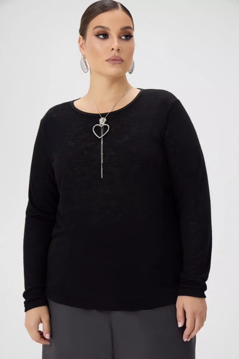 Длина лонгслива по спинке составляет 64 см. На модели с параметрами 174 см роста, ОГ 112 см, ОТ 100 см и ОБ 127 см представлен размер 54, который соответствует её фигуре. Артикул изделия: 100063.