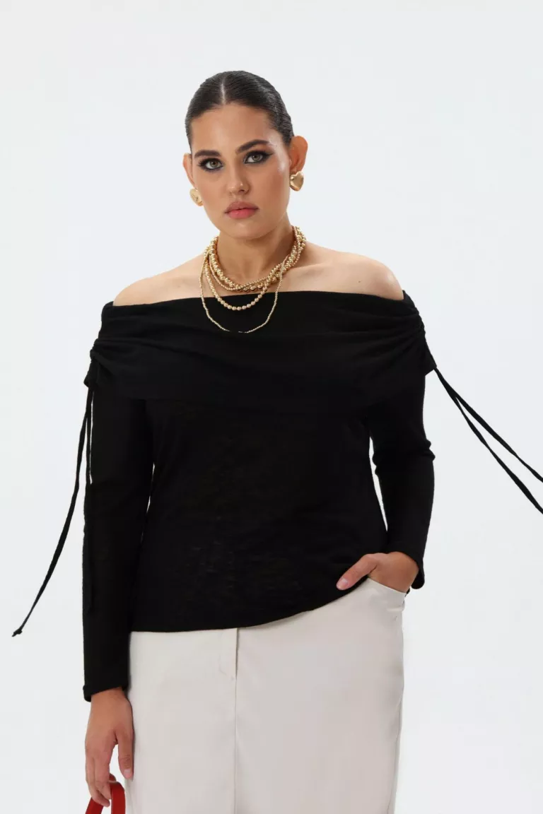 Лонгслив regular fit из смесовой вискозы, главная особенность которой универсальность, благодаря чему вещь в большинстве случаев не висит на теле как мешок, при этом сильно не прилегает. Длина до середины бедра, горловина с вырезом лодочка и открытыми плечами. Воротник с напуском, с боковой кулиской. Рукав длинный, пройма широкая.