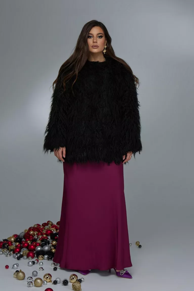 Однобортный жакет прямого кроя из пушистого экомеха ламы, на подкладке. Длина миди. Без воротника, вырез горловины округлый. Рукав длинный, пройма углубленная. В качестве застежки внутренние кнопки.