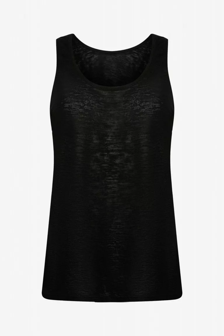 Топ свободного кроя, в рубчик, из смесового вискозного органического трикотажа с хорошей эластичностью. Длина до середины бедра. Горловина округлая. Пройма широкая.