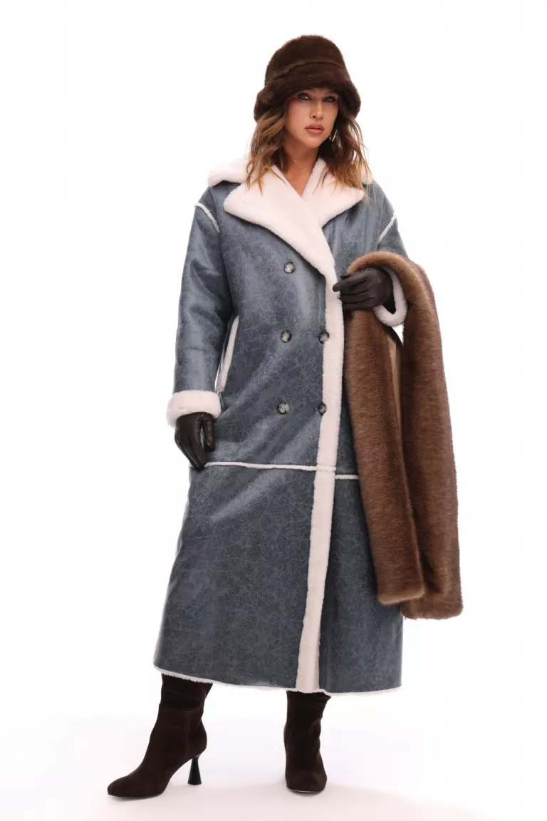 Пальто дубленка из двусторонней ткани на шерстяной основе (меринос). Дубленка двубортная. Длина макси. Воротник английский. Спереди двустороння застежка на пуговицы и внутренние карманы. Рукав длинный, пройма широкая. Покрытие пул-ап — натуральная кожа изготавливается из премиальных шкур Она относится к классу люкс. Комплектуется поясом.
