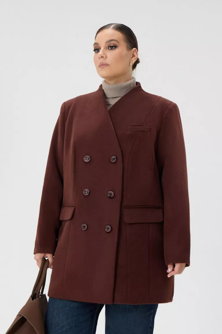 Полупальто приталенного силуэта, двубортное, на подкладке и пуговицах из смесовой шерсти. Длина миди. Воротника нет, лацканов нет. На спинке и спереди рельефы. Спереди прорезные карманы. Рукав длинный, с выраженной линией плеча, пройма углубленная. Застежка пуговицы.