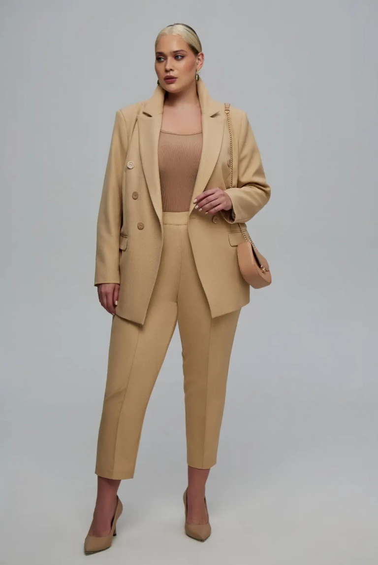 Пиджак песочного оттенка – необходимая база гардероба. Красивый теплый оттенок великолепно сочетается с монохромами, а также яркими акцентными цветами. В представленном визуале в качестве нижнего гардероба мы использовали брюки-дудочки со стрелками и дополнили образ подчеркивающими стиль Old money аксессуарами. Получилось сдержанно и лаконично!