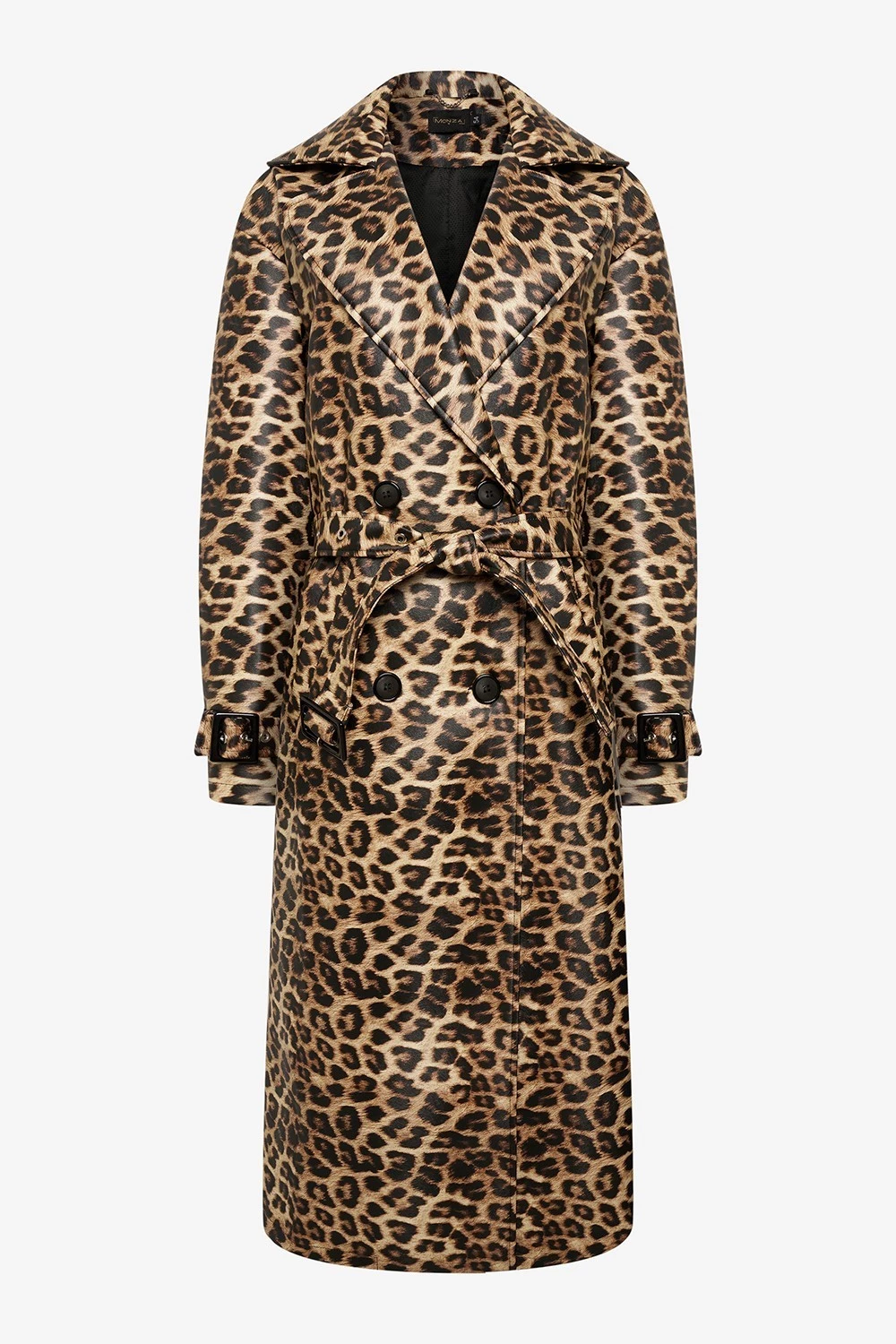 Двубортный кожаный тренч принтованный в анималистичном стиле