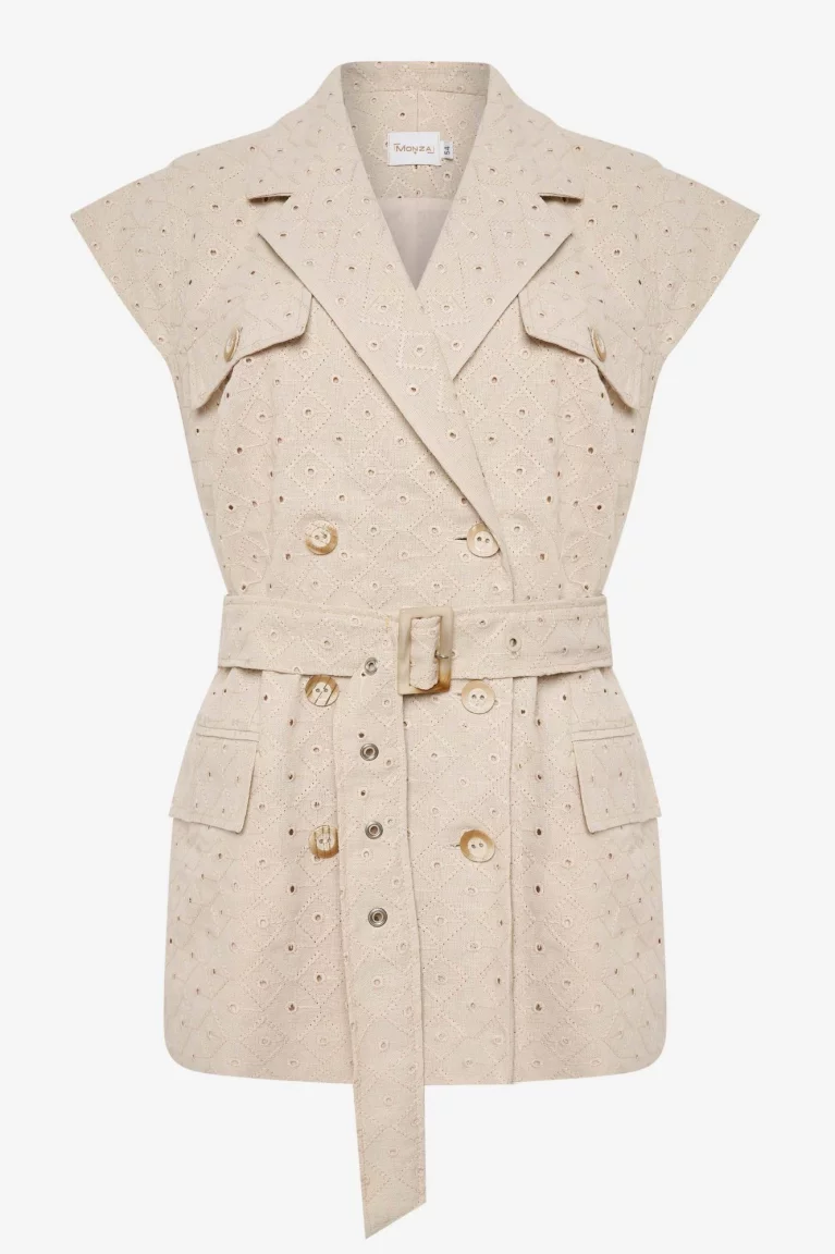 Двубортный жилет полуприлегающего силуэта, на подкладке и пуговицах из ткани шитье (английская вышивка). Длина миди. Воротник английский, с лацканами. На спинке рельефы, центральный шов. Спереди вертикальные внутренние карманы и клапаны. Выраженная прикрытая линия плеча. Комплектуется поясом.
