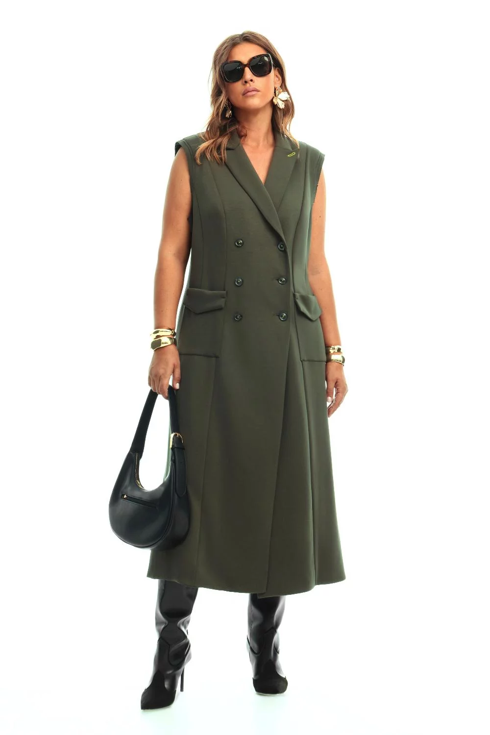 Двубортный макси-жилет прямого силуэта с подкладкой и пуговицами выполнен из плотного трикотажа. Воротник английский с лацканами, что придает модели элегантный и сдержанный вид. Рельефы на спинке и спереди, а также центральный шов подчеркивают структуру изделия. Спереди расположены вертикальные вытачки и накладные карманы, добавляющие функциональности и стиля. Выраженная линия плеча с необработанным краем придает образу современный и слегка дерзкий оттенок, а пуговицы служат застежкой. По бокам находятся разрезы для удобства.