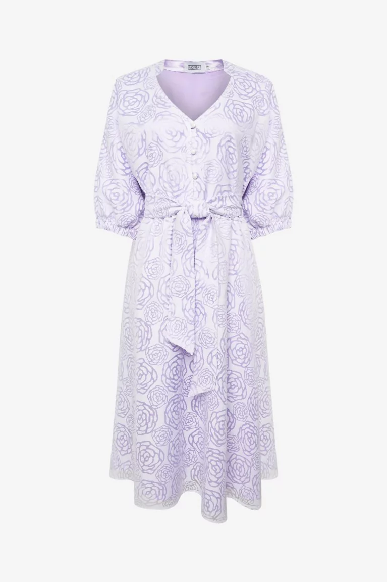 Платье двуслойное, из ткани сетка с принтом, на шелковой подкладке, длина миди. Горловина «V»-образная с воротником стойка, спереди застежка пуговицы. Отрезное по талии, на внутренней резинке, с расклешенной юбкой. Рукав цельнокроеный, фонарик, 3/4, на манжете, пройма углубленная. Комплектуется поясом.