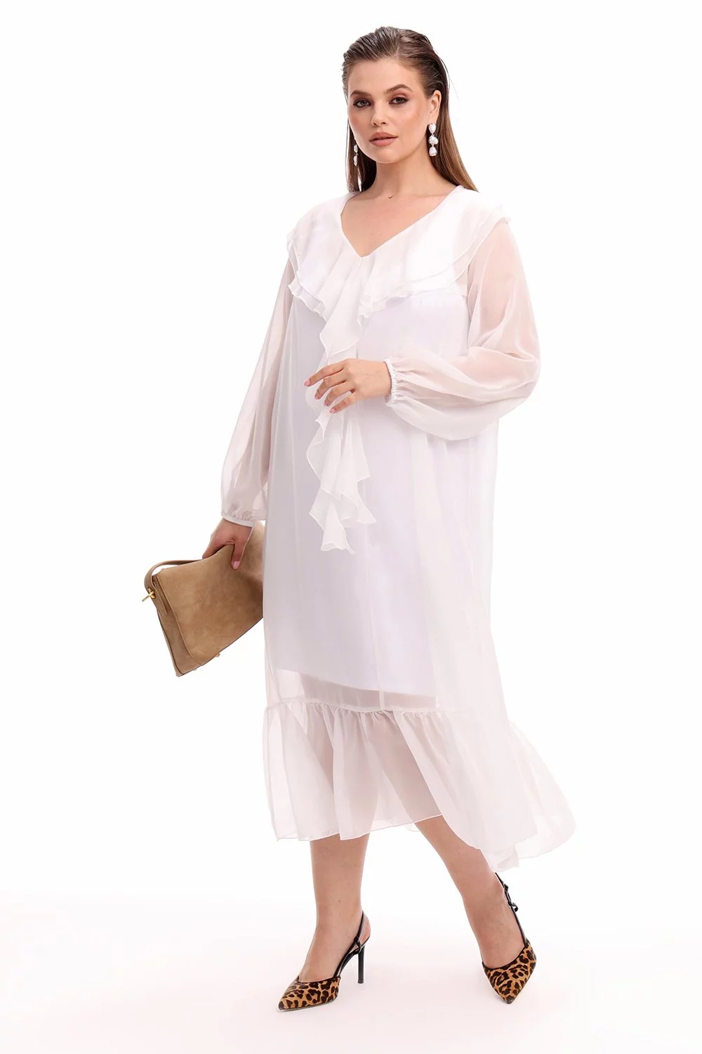 Двуслойное платье из смесовой вискозы, с нижним трикотажным хлопковым платьем, длина миди. Вырез треугольный, без застежки, отделанный воланом. Рукав длинный, объемный, на резинке, пройма широкая. По низу воланы.