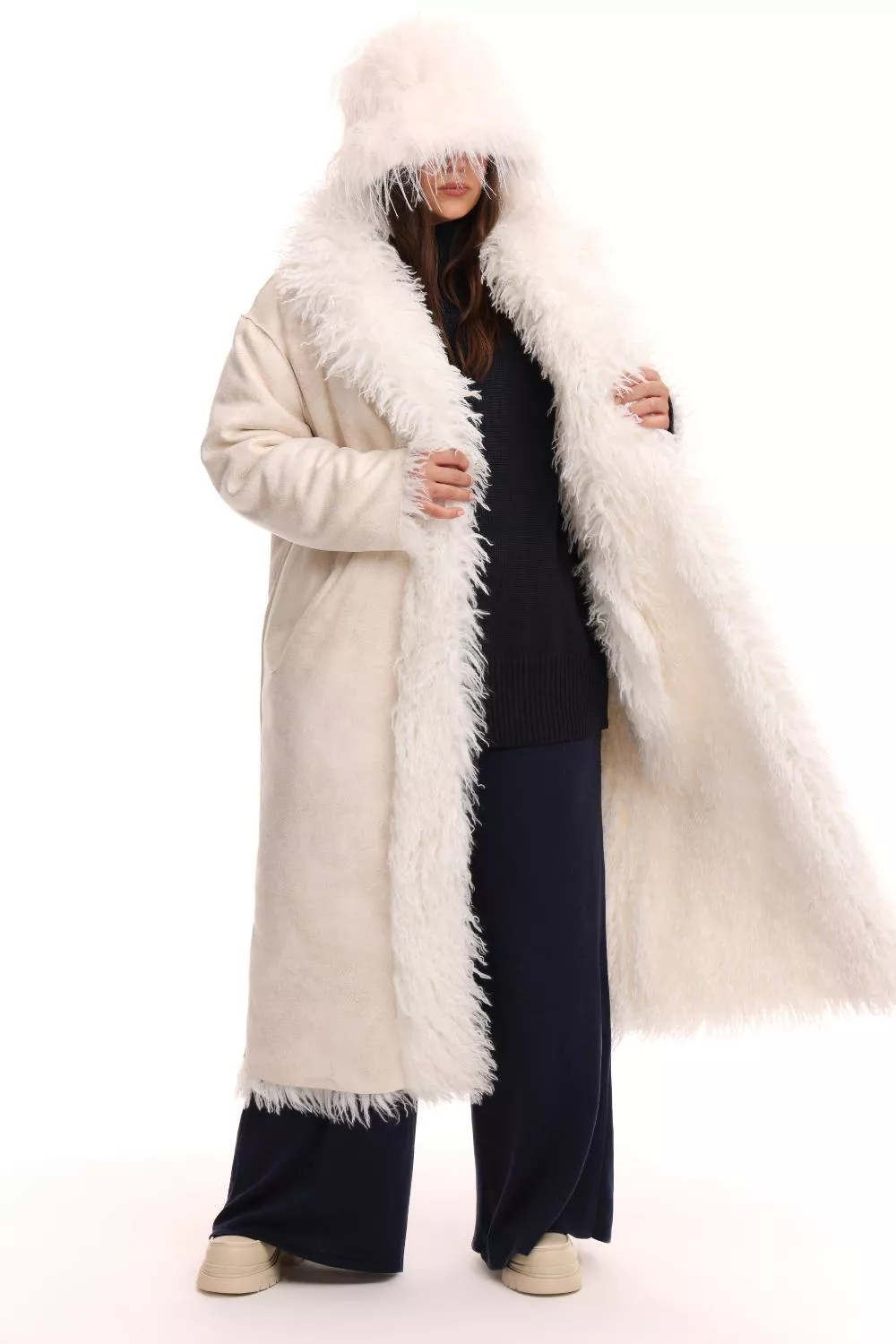 Двусторонняя дубленка пенни лайн выполнена из меха ламы с длинным ворсом на трикотажной замшевой основе. Дубленка прямого силуэта, однобортная, с длиной миди. Воротник отложной, с лацканами, длинные рукава и широкие проймы, что обеспечивает комфорт и свободу движений. Спереди пальто застегивается на кнопки и имеет внутренние карманы. Необработанные края по низу и рукавам.