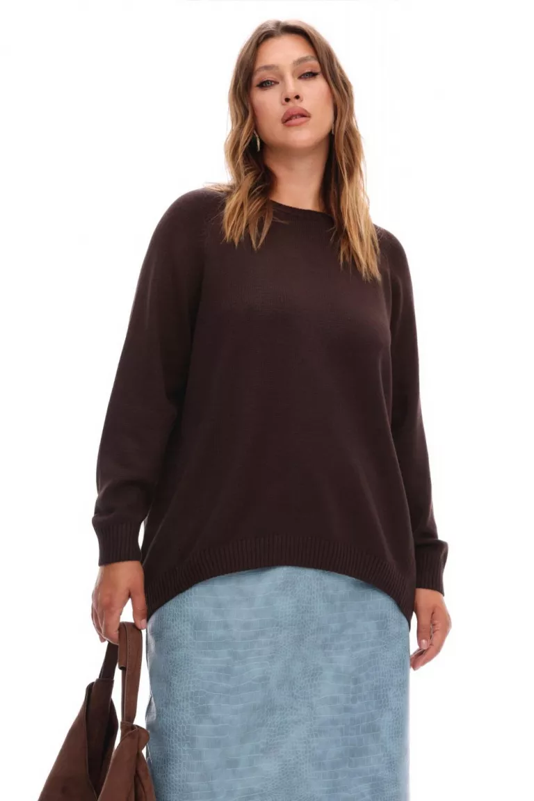Джемпер бойфренд из вискозного трикотажа. Длина до середины бедра, разноуровневая. Горловина округлая. Рукав реглан, длинный, пройма глубокая.