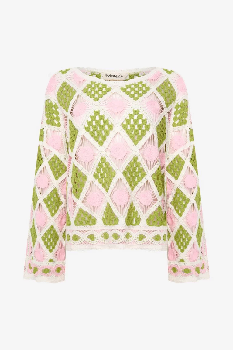 Джемпер из вязаного трикотажа кроше. Длина до талии. Горловина округлая, рукав длинный спущенный.