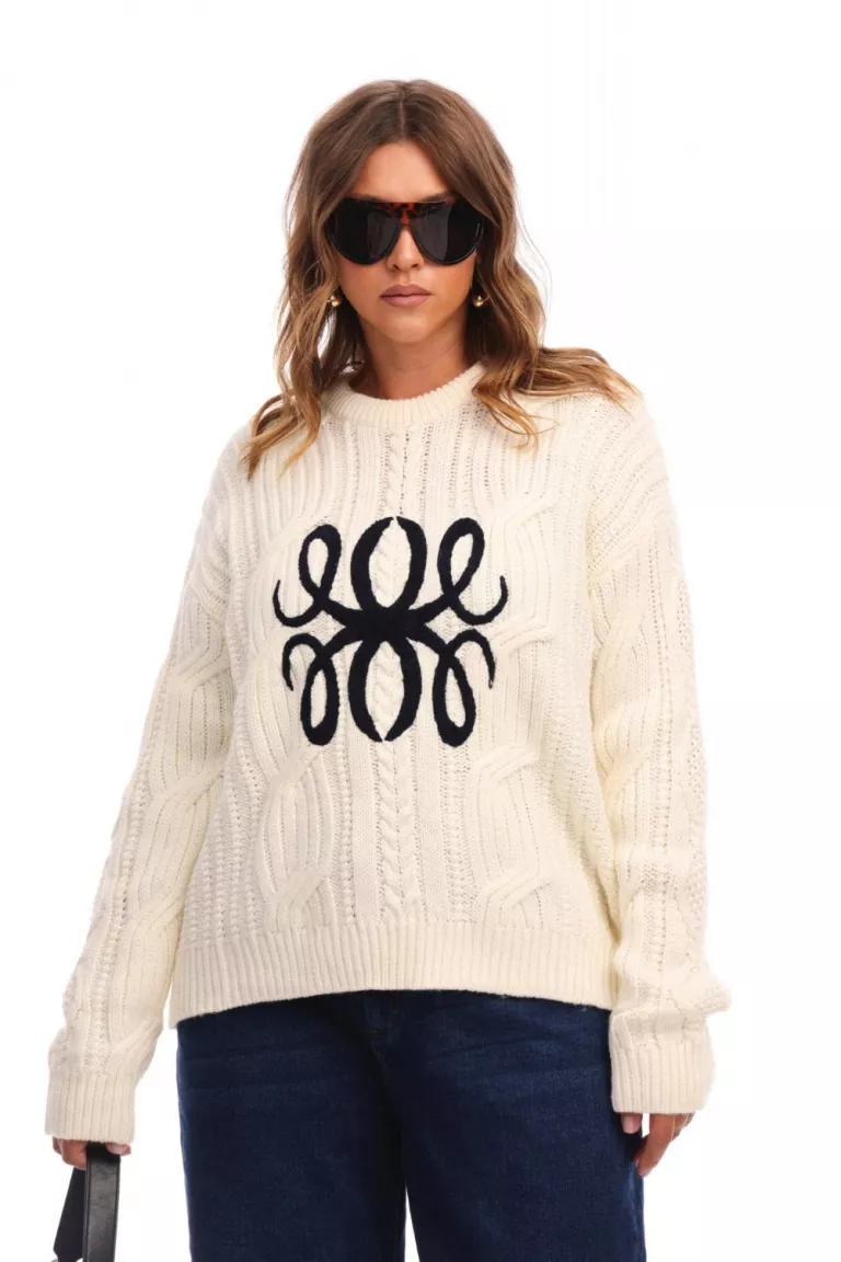 Джемпер с вязкой коса и вышивкой