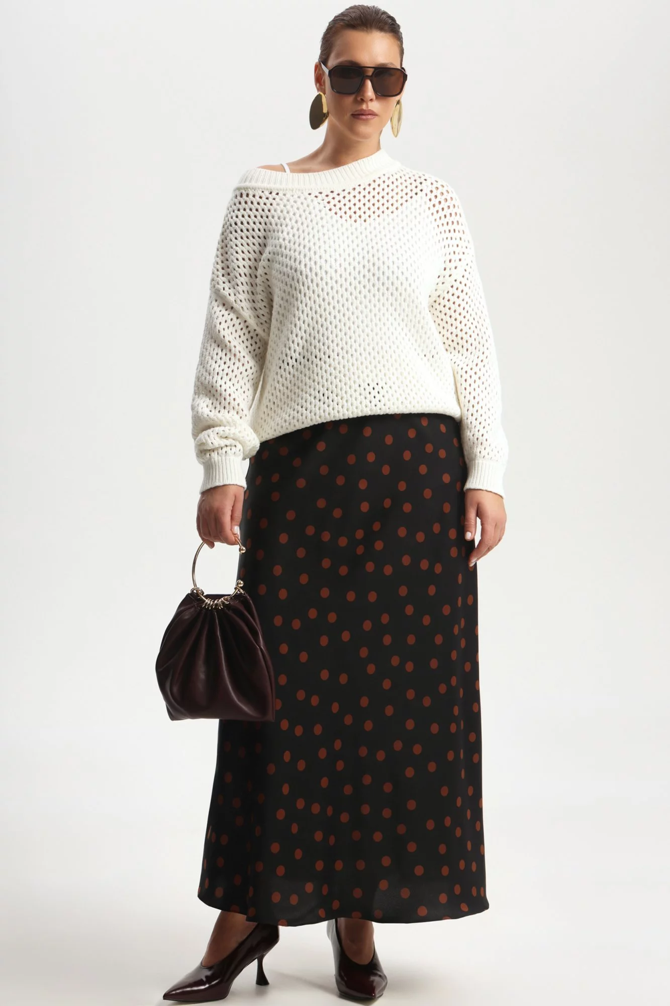 Джемпер сетка из поливискозного трикотажа. Длина до середины бедра. Горловина округлая. Рукав длинный, пройма глубокая.