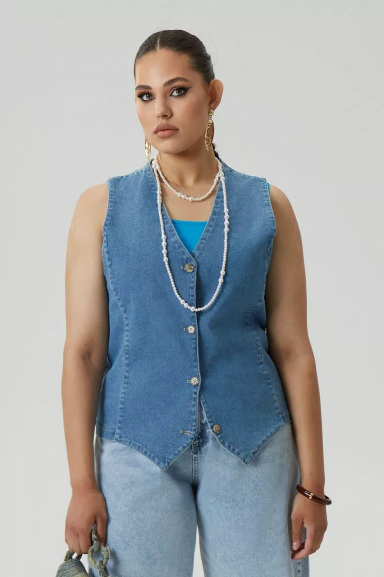 Жилет из денима – супертренд сезона. Сочетайте с любимыми футболками, юбками, джинсами, и не бойтесь миксовать с нашими облегченными палаццо – так образ будет более сложным.