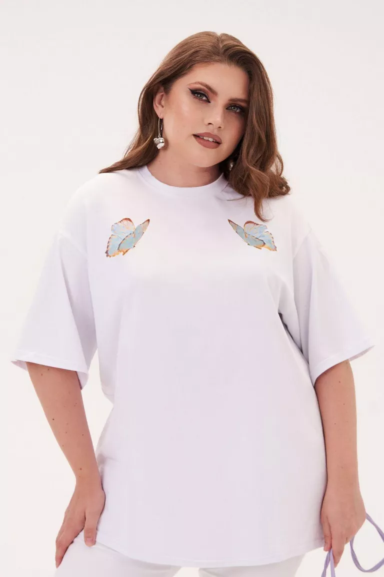 Футболка оверсайз из хлопка. Длина до середины бедра. Горловина округлая, рукав короткий. Базовая вещь в вашем гардеробе. Стиль оверсайз — это свобода движения. Ведь такая одежда позволяет чувствовать себя комфортно и стильно одновременно. Стиль oversize подходит для любой фигуры, ведь он может скрыть недостатки фигуры и подчеркнуть ее достоинства. Стиль оверсайз подразумевает намеренный выбор вещей большего размера, чем необходимо, включает в себя предметы одежды мешковатого кроя. В данном стиле привлекают именно свобода кроя, непринужденность и комфорт, который так важен в повседневной жизни. Оверсайз подчеркивает женственность, при этом позволяет скрыть некоторые недостатки фигуры и подчеркнуть достоинства. Спереди постер.