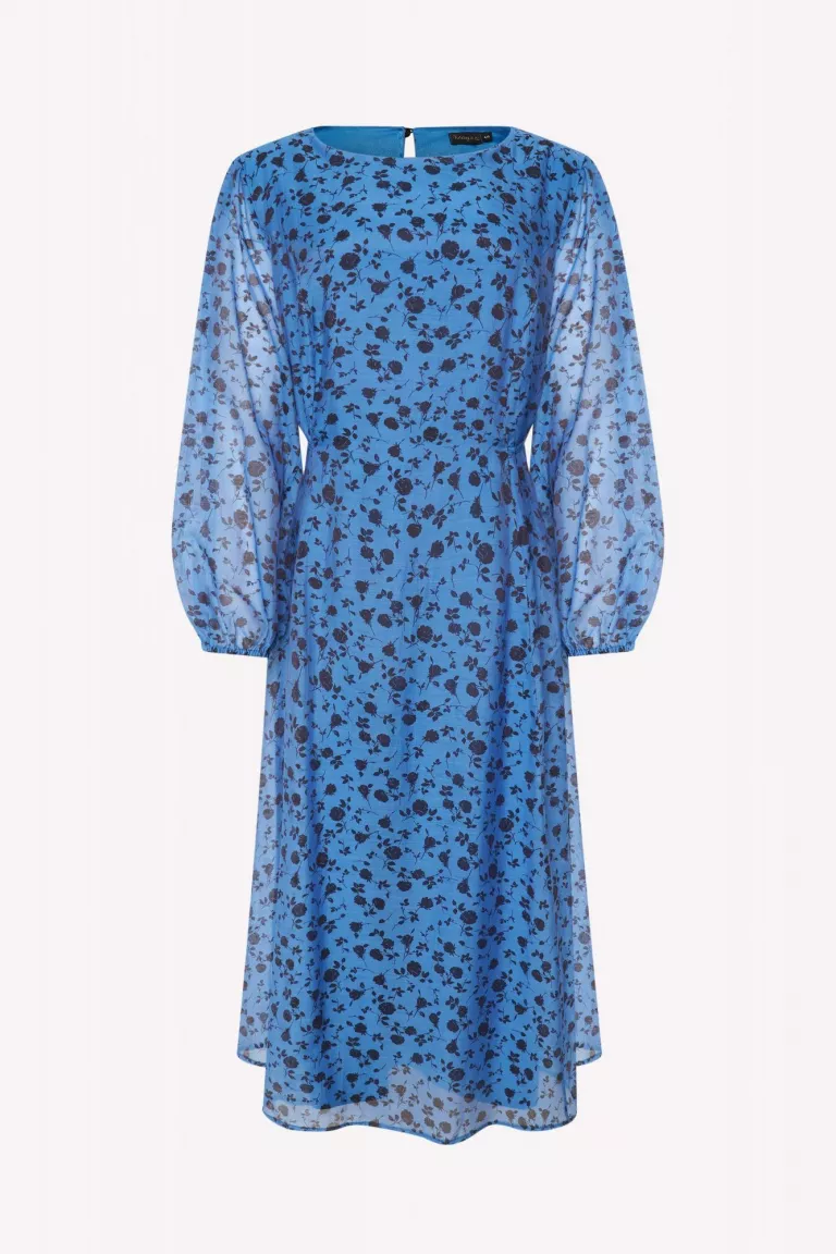 Чайное платье из тенселя на шелковой подкладке А-силуэта, длина миди. Горловина округлая, сзади застежка на пуговицу. Рукав длинный, на манжете, пройма широкая. Спереди рельефы. Нижняя часть расклешенная, на боковом вшитом поясе.