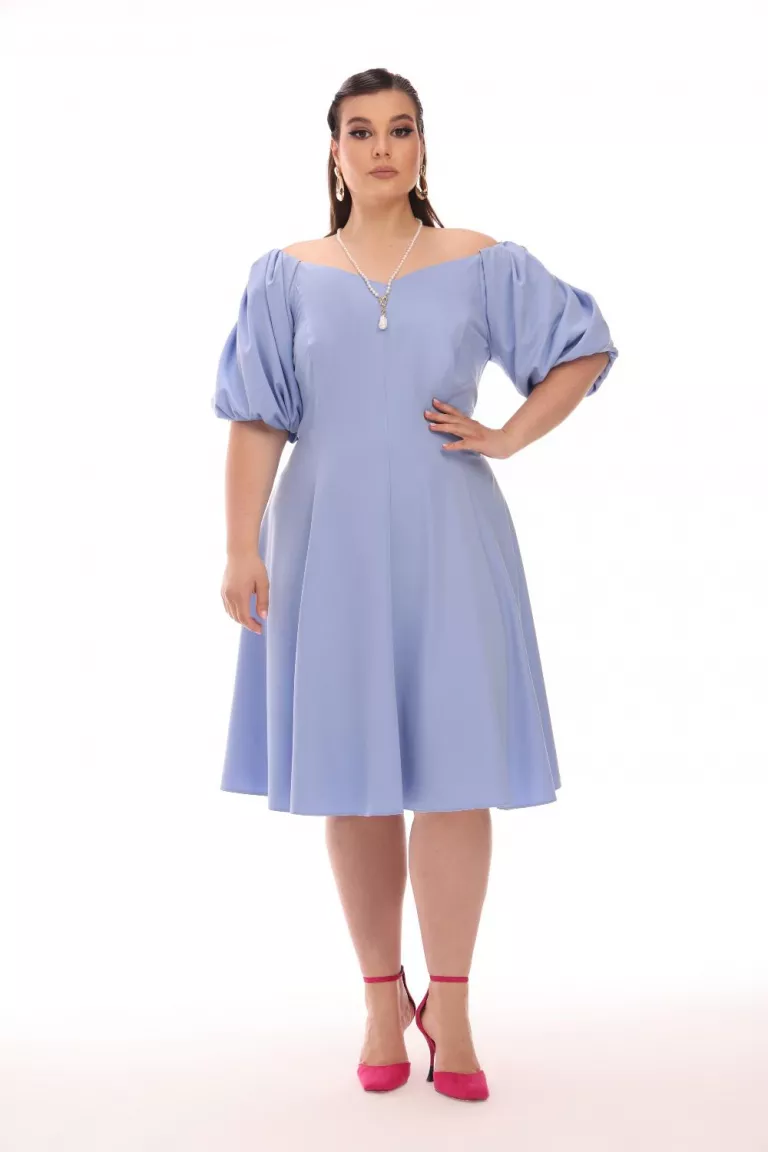 Платье приталенного силуэтного покроя, из смесовой вискозы, длина миди. Горловина лодочка с V- вырезом в зоне декольте. Отрезное с рельефами и расклешенной юбкой. Рукав реглан, фонарик-баллон, 3/4, на подкладке, пройма углубленная.