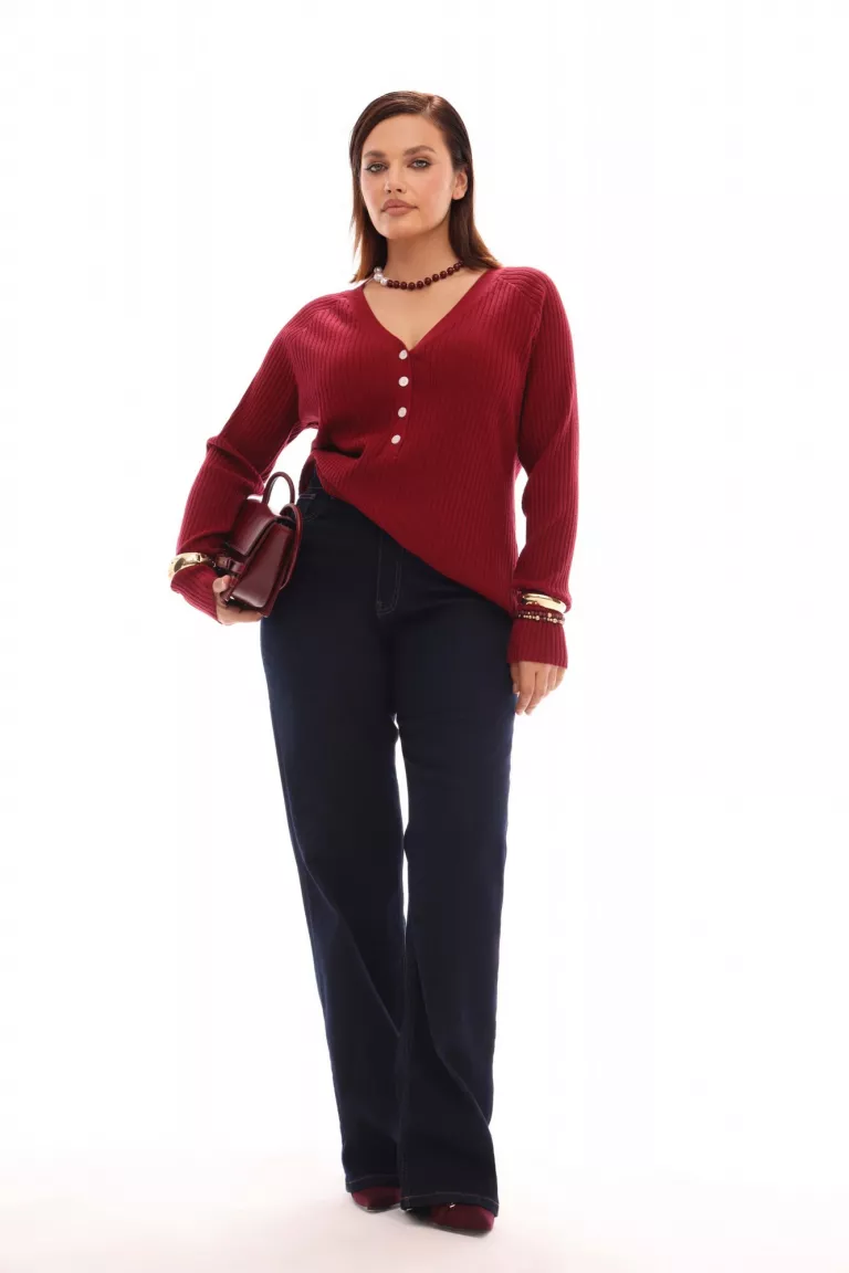 Джемпер лапша из вязанной смесовой вискозы. Рукав длинный, вырез V-образный, на пуговицах сверху. Длина до середины бедра.
