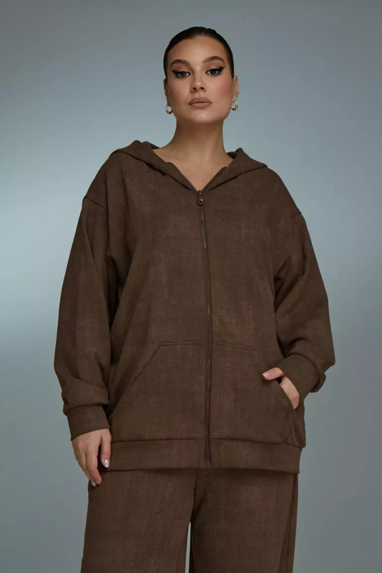 Зип-худи из качественного трикотажа с эффектом гармент дай, повседневно-спортивного стиля, на молнии. Капюшон двойной. Длина миди. Рукав длинный, на манжете, пройма широкая. Карманы кенгуру.