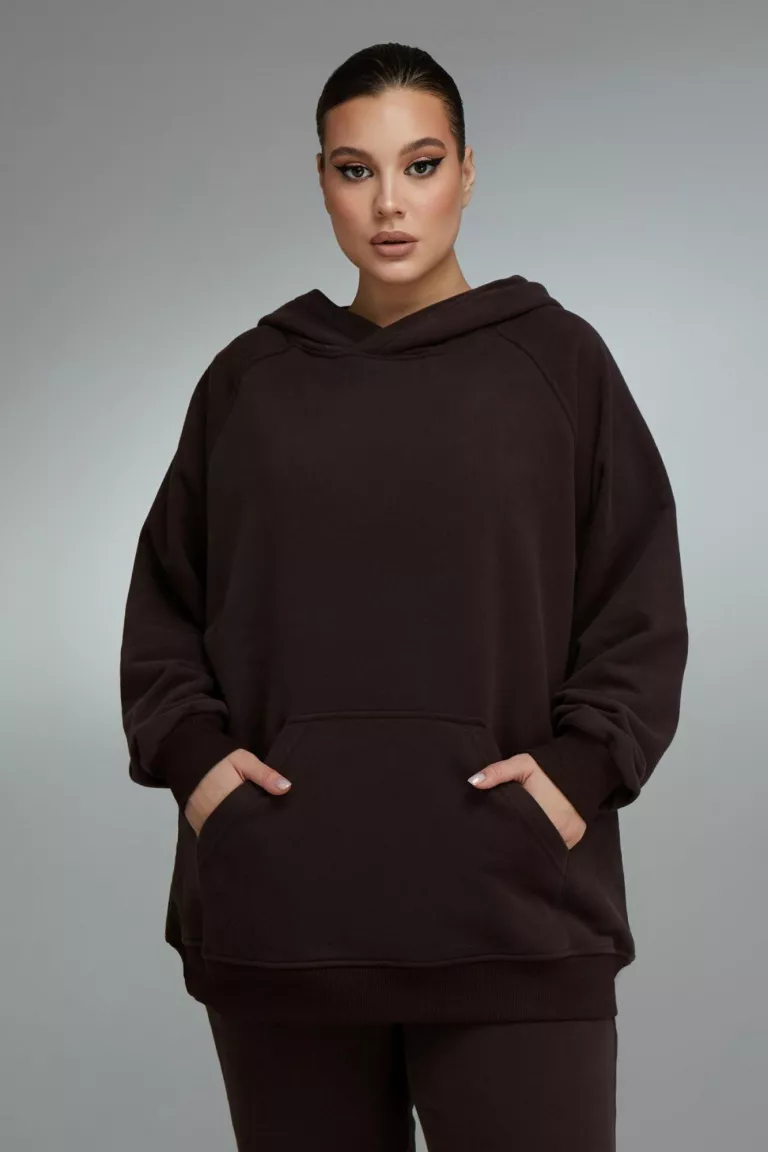 Тёмно-коричневое худи будет хорошо смотреться с джинсами, брюками или джоггерами. К нему подойдут ботинки, кроссовки, ботильоны на каблуке и кеды. В качестве аксессуаров можно использовать сумку через плечо или рюкзак.
