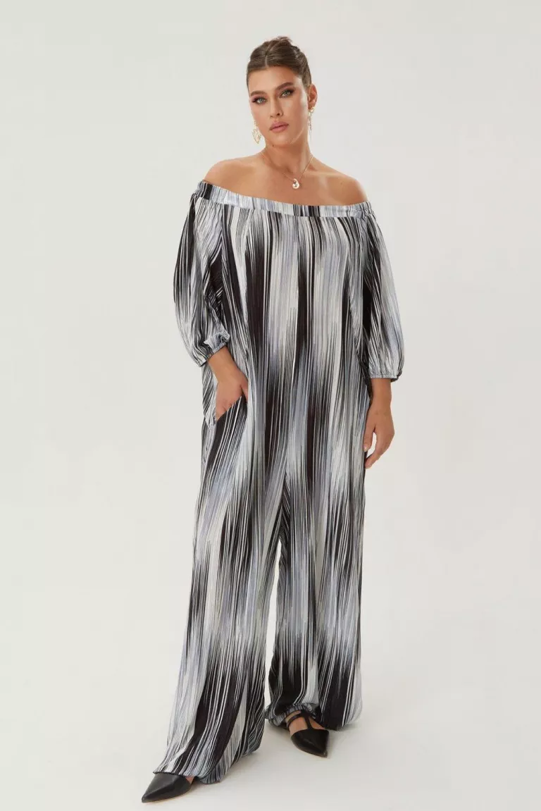 Комбинезон оверсайз из смесовой вискозы с мелкой гофрировкой, без подкладки, длина миди. Горловина лодочка, на резинке. Рукав реглан, фонарик, 3/4, на манжете, пройма углубленная. Спереди карманы с отрезным бочком.