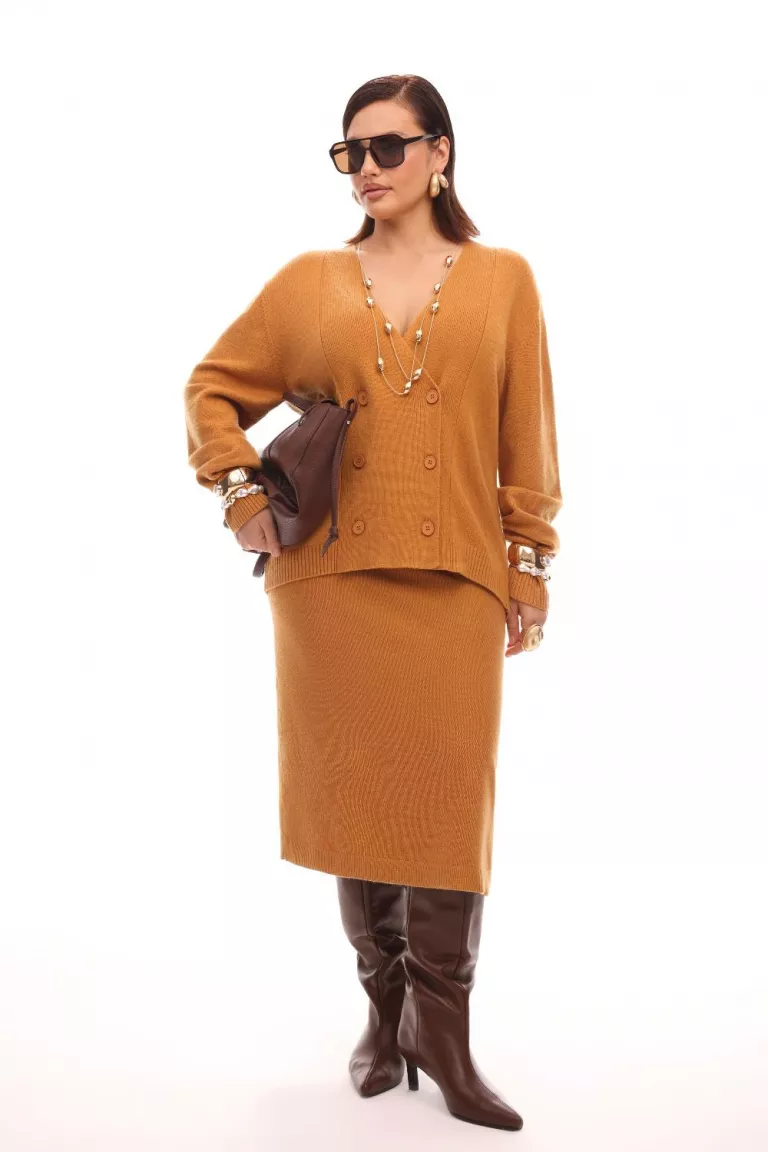 Двубортный жакет из вязаного смесового трикотажа. Длина до бедра. Без воротника и лацканов. Рукав длинный, пройма углубленная. В качестве застежки пуговицы. Прямая юбка из вязанного смесового трикотажа с хорошей эластичностью. Юбка макси, на широком поясе-резинке. Сзади разрез.