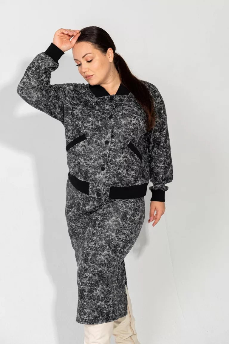 Костюм бомбер и юбка трикотаж серого цвета c эффектом stone wash