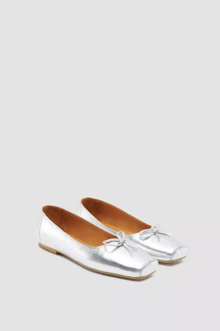Балетки на низком каблуке из серебряной кожи. Мыс квадратный. Стелька из кожи. Полнота увеличена.
