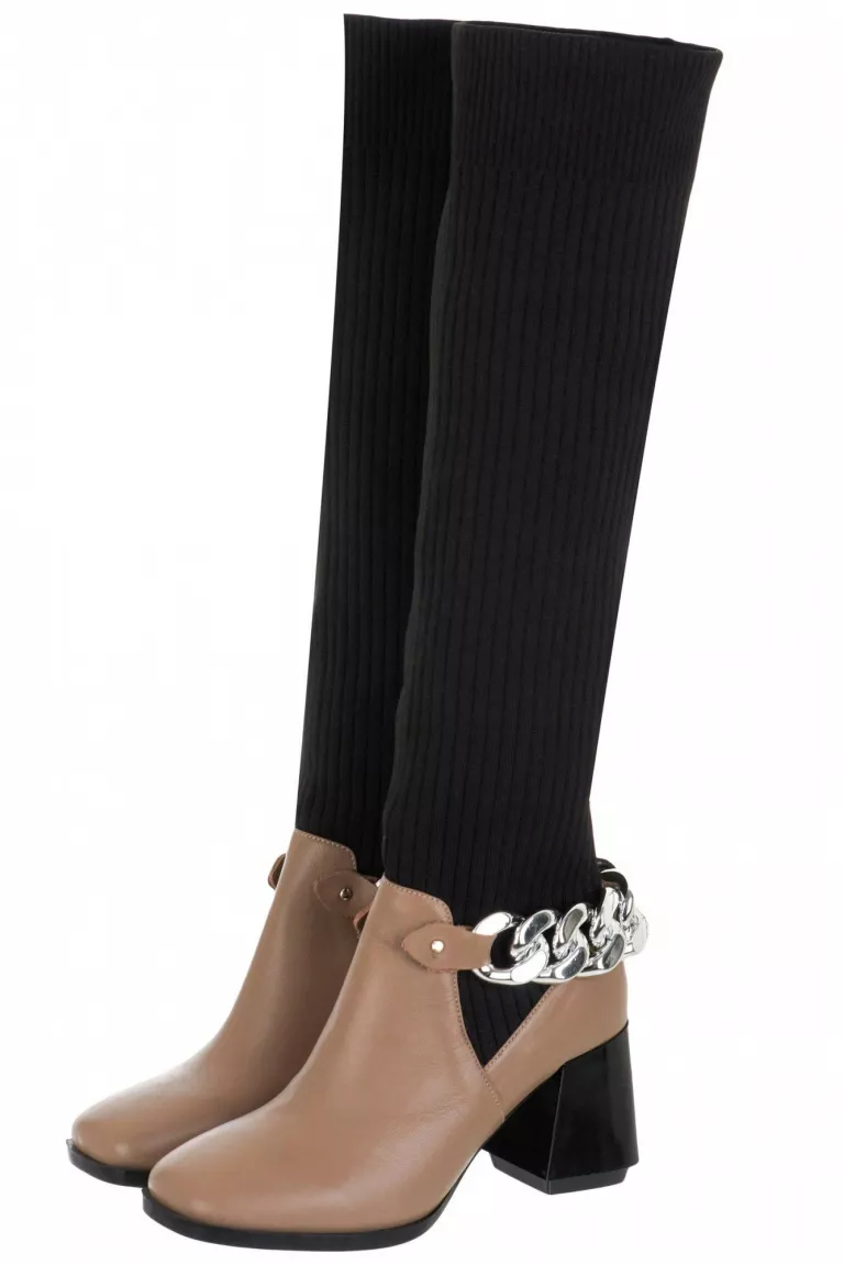 Кожаные сапоги на каблуке и с цепочкой цвета капучино