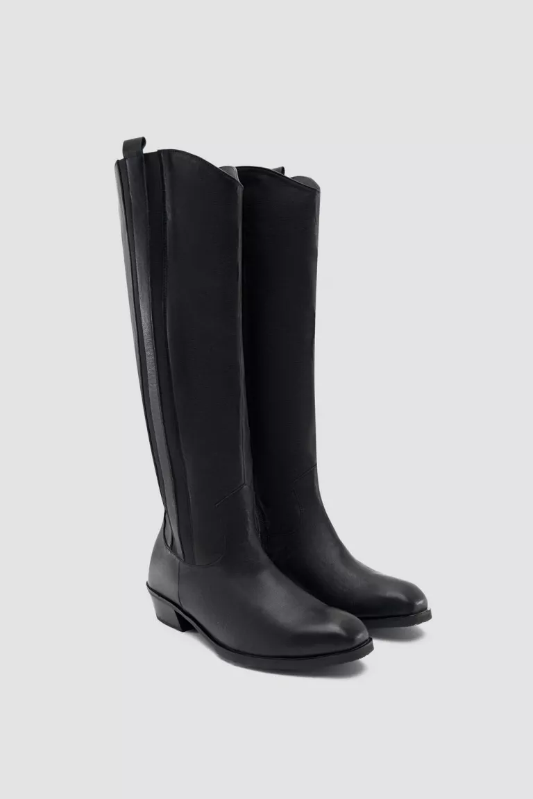 Сапоги в жокейском стиле из кожи, с эластичными вставками в районе голенища, на небольшом каблуке, с молнией. Мыс слегка тупой. Стелька из текстиля. Застежка молния. Полнота увеличена.