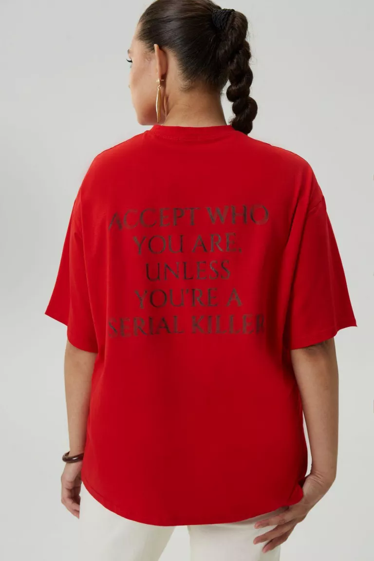 Футболка оверсайз из хлопка. Длина до середины бедра. Горловина округлая, рукав короткий. Базовая вещь в вашем гардеробе. Стиль оверсайз — это свобода движения. Ведь такая одежда позволяет чувствовать себя комфортно и стильно одновременно. Стиль oversize подходит для любой фигуры, ведь он может скрыть недостатки фигуры и подчеркнуть ее достоинства. Стиль оверсайз подразумевает намеренный выбор вещей большего размера, чем необходимо, включает в себя предметы одежды мешковатого кроя. В данном стиле привлекают именно свобода кроя, непринужденность и комфорт, который так важен в повседневной жизни. Оверсайз подчеркивает женственность, при этом позволяет скрыть некоторые недостатки фигуры и подчеркнуть достоинства. Спереди постер.