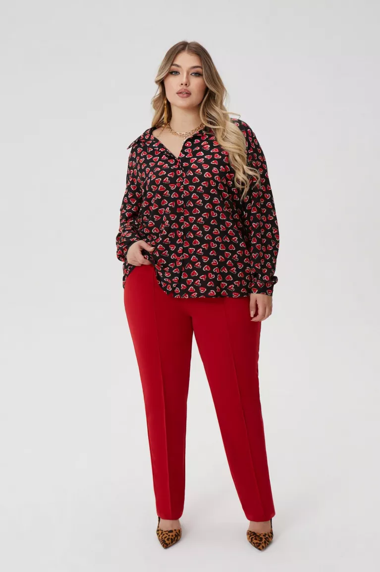 Красные брюки классического, прямого силуэта будут хорошо сочетаться с различными вариантами верха. Например, вы можете выбрать рубашку с красным принтом — для нарядного образа, или красный пиджак и белый топ — для более делового стиля. Из обуви подойдут туфли-лодочки, босоножки на каблуке или ботильоны. Аксессуары, такие как часы, серьги и сумка, помогут завершить образ.