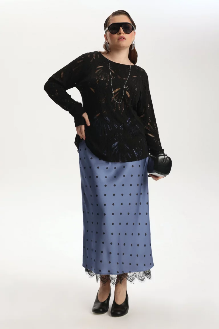 Лонгслив из поливсикозного трикотажного кружева, свободного силуэта. Длина до середины бедра, горловина округлая. Рукав длинный, пройма широкая, на конце отверстие для пальца.