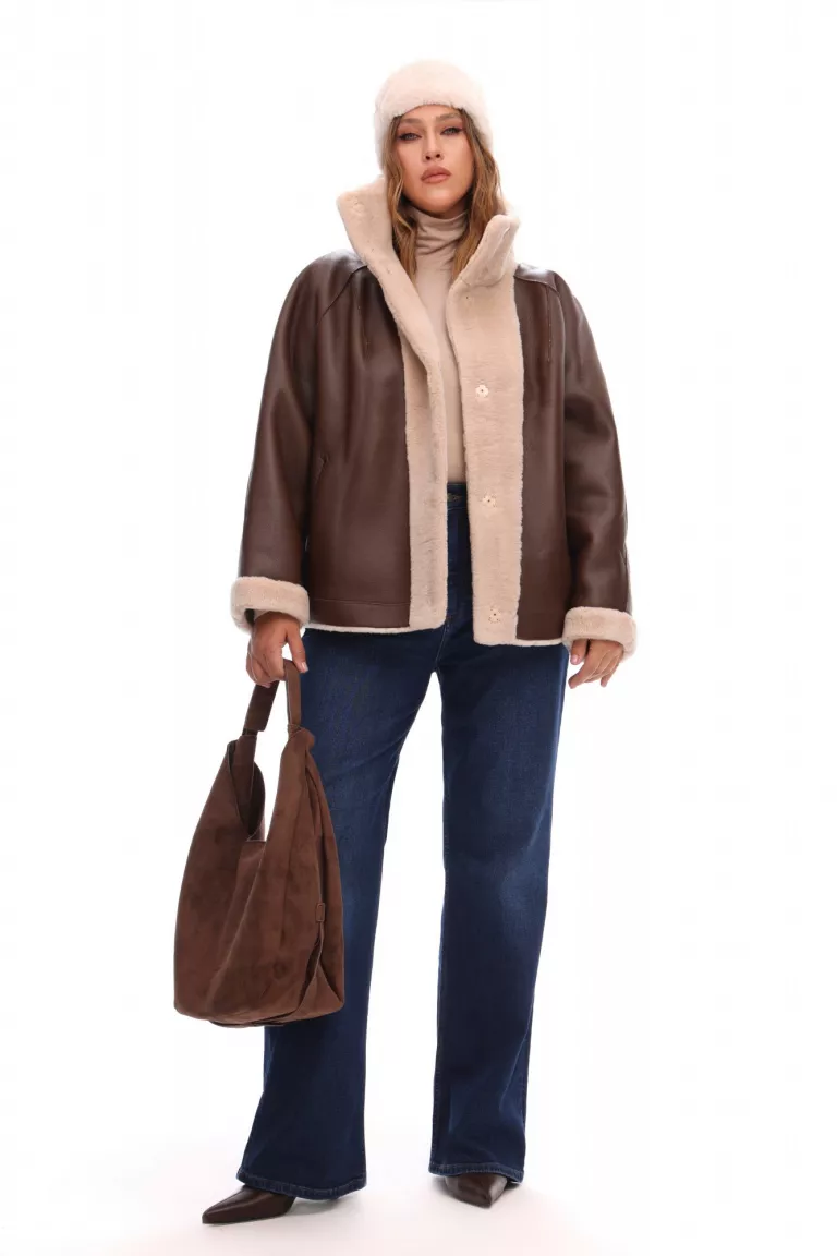 Куртка дубленка из двусторонней ткани на шерстяной основе (меринос). Дубленка с внутренней застежкой кнопки. Длина до середины бедра. Воротник высокая стойка. Спереди внутренние карманы. Рукав реглан, длинный, широкий, с меховой опушкой, пройма широкая. Покрытие экокожа наппа пропитана раствором, содержащим искусственную полимерную кожу, поверхность дубленки при этом выглядит как кожаная. Можно носить на две стороны.
